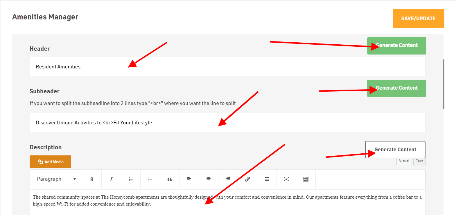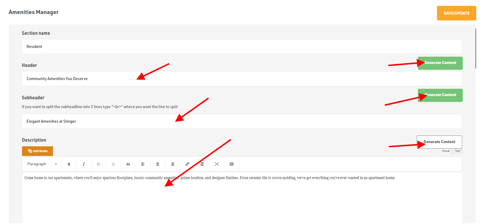 Then fill the Header, Sub-header and Description. You can type your own content or else use our Generate Content AI option which will generate relevant text as per your content.