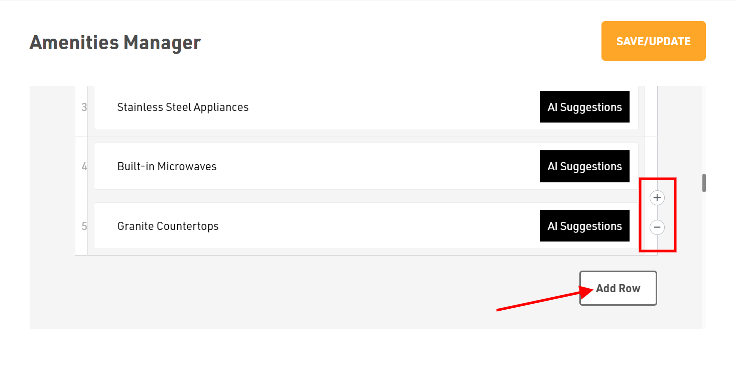 Whenever you want to add or remove new amenities click on Add Row or you can click on + or - sign available on the right side of the Amenities name.