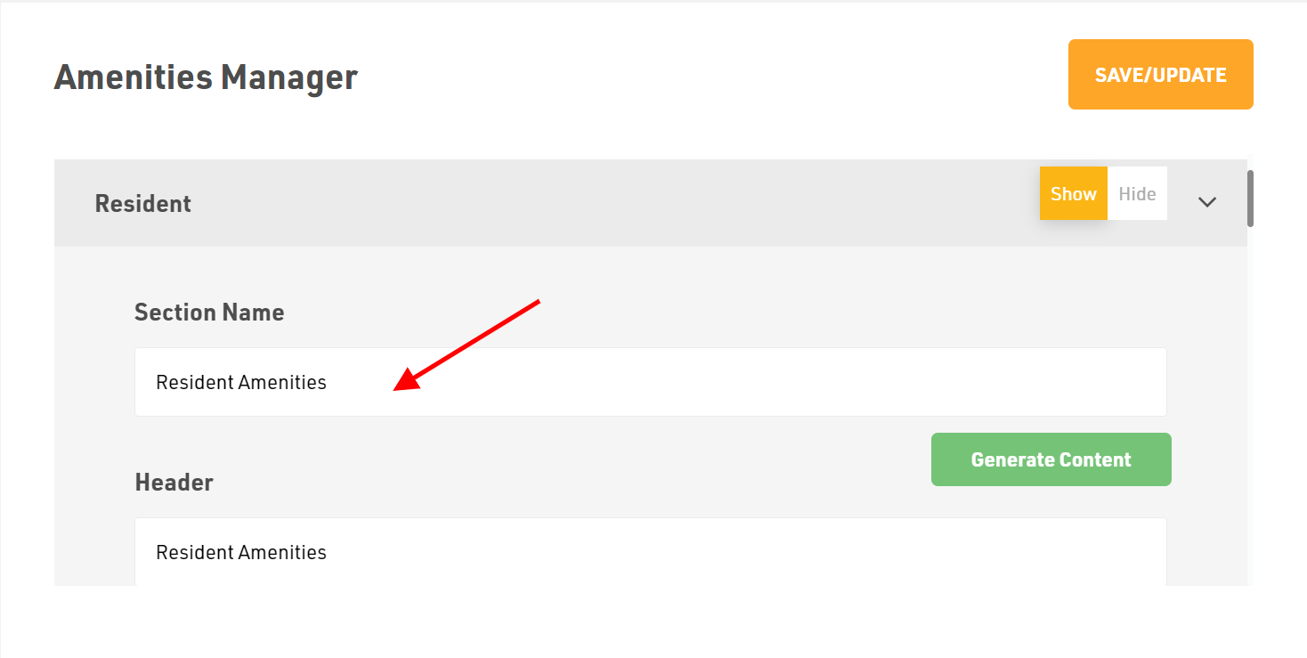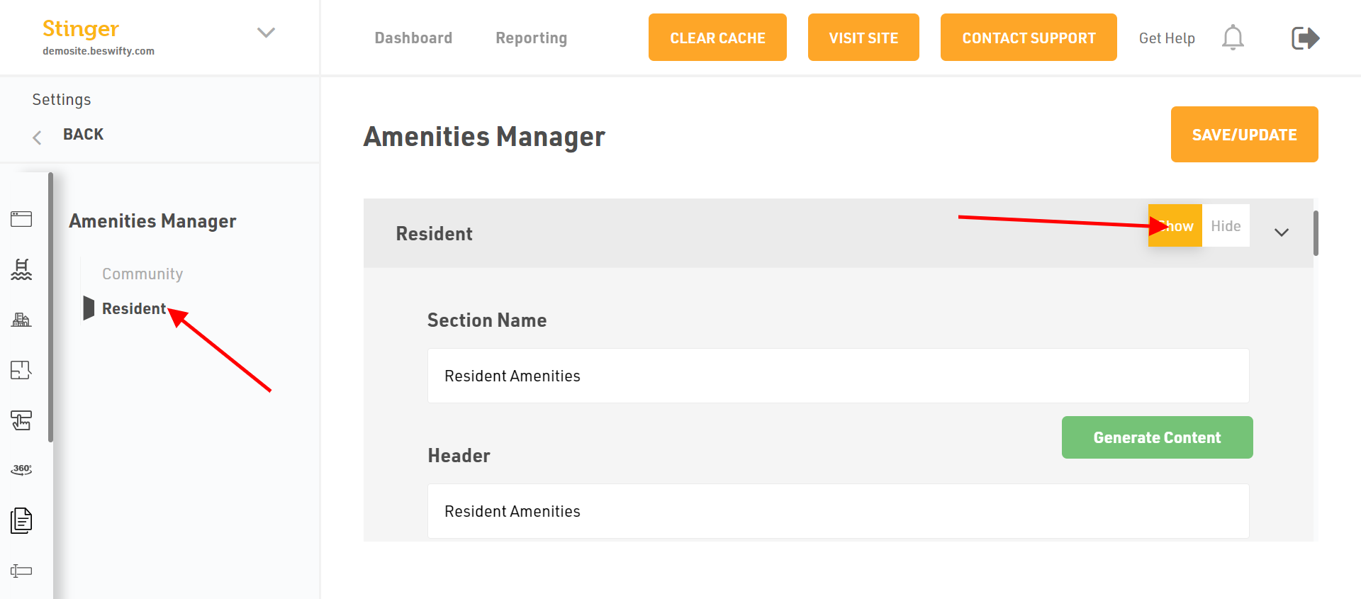 First click on the Resident in the left sidebar and choose whether to Show or Hide this section in the website.