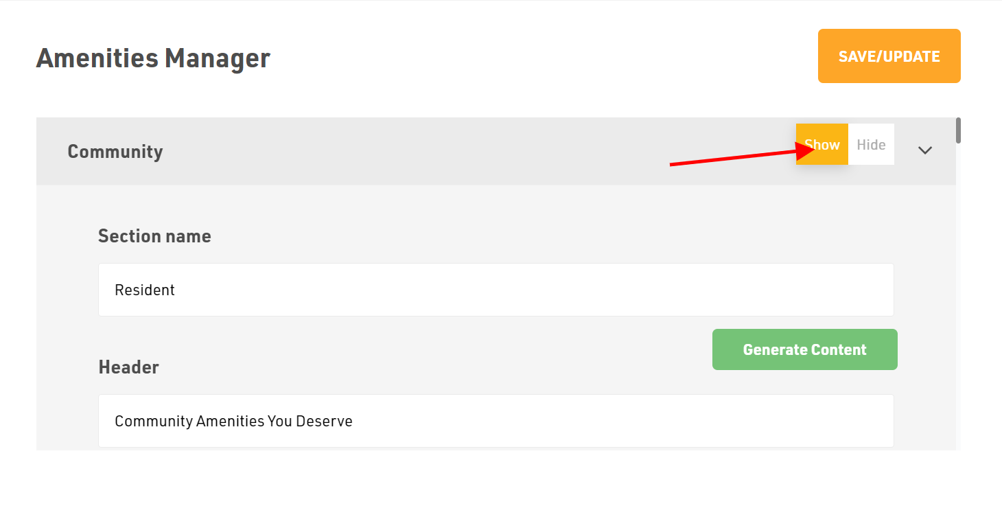 In Community Amenities, first choose whether to Show or Hide this section on the website.