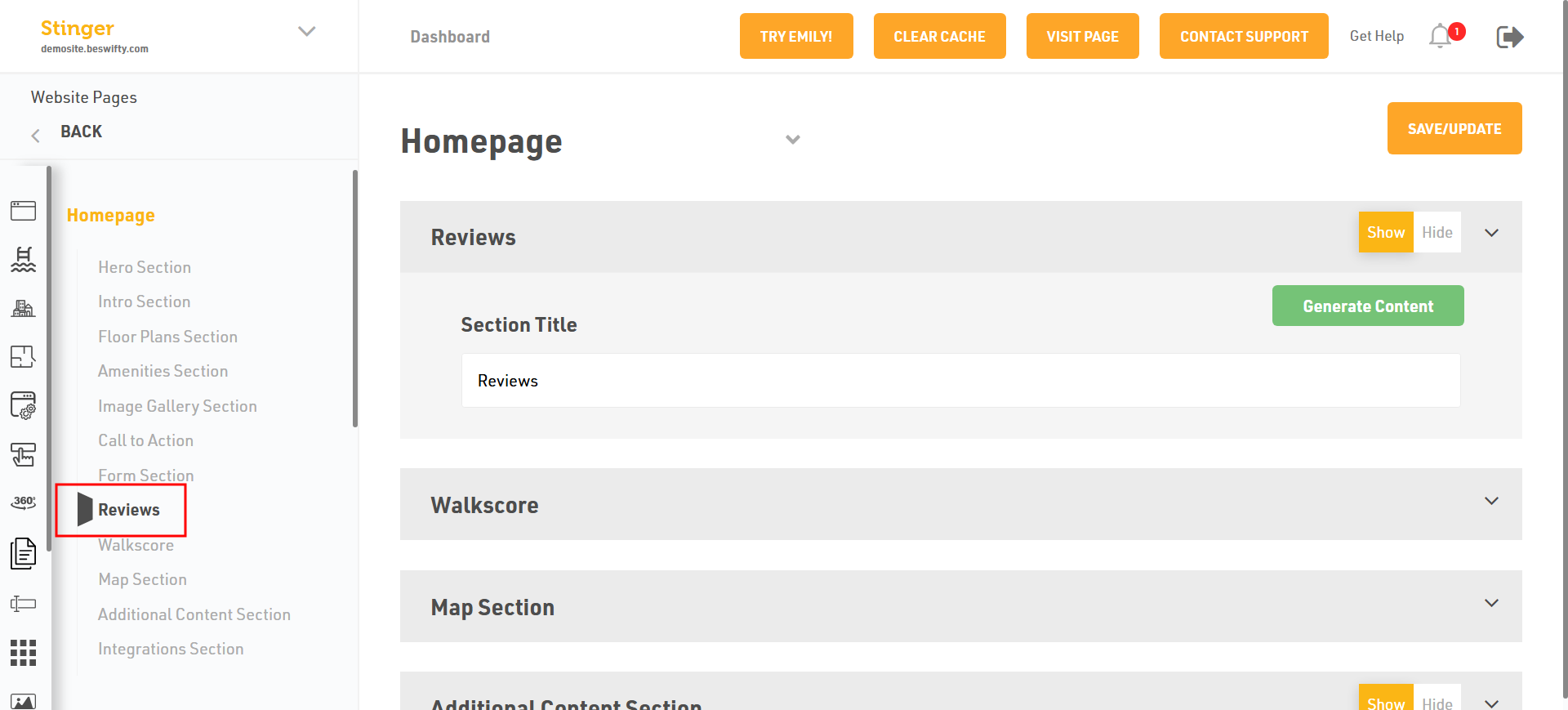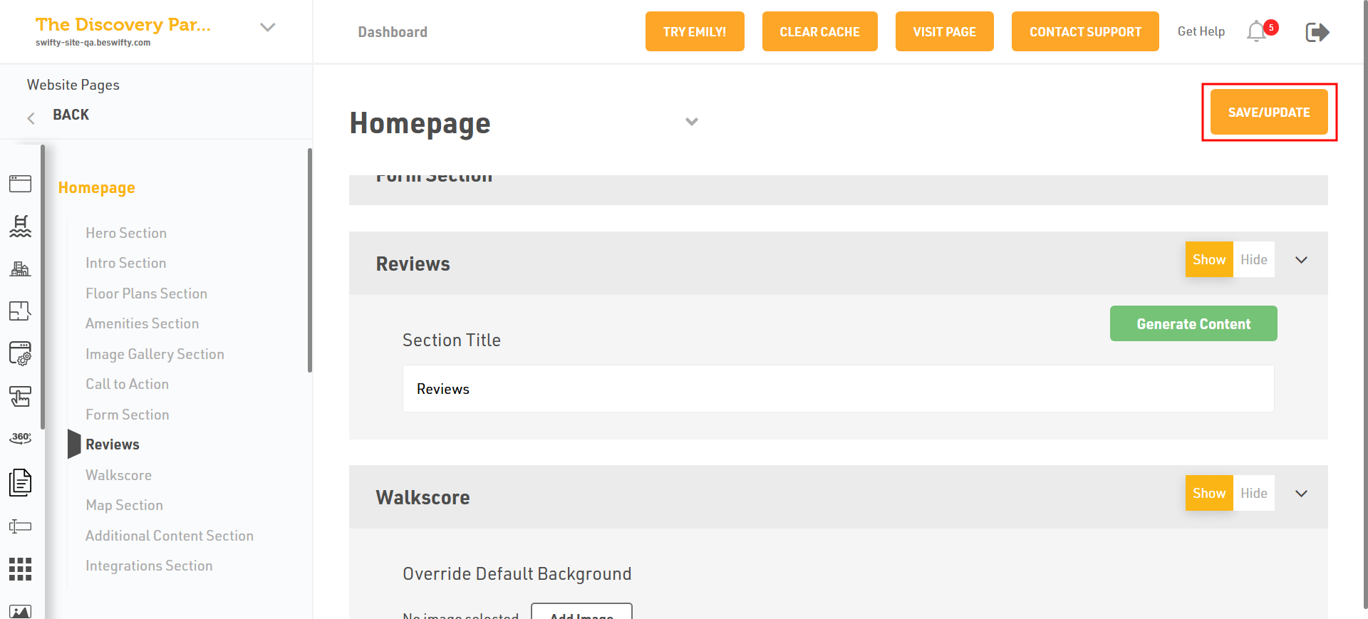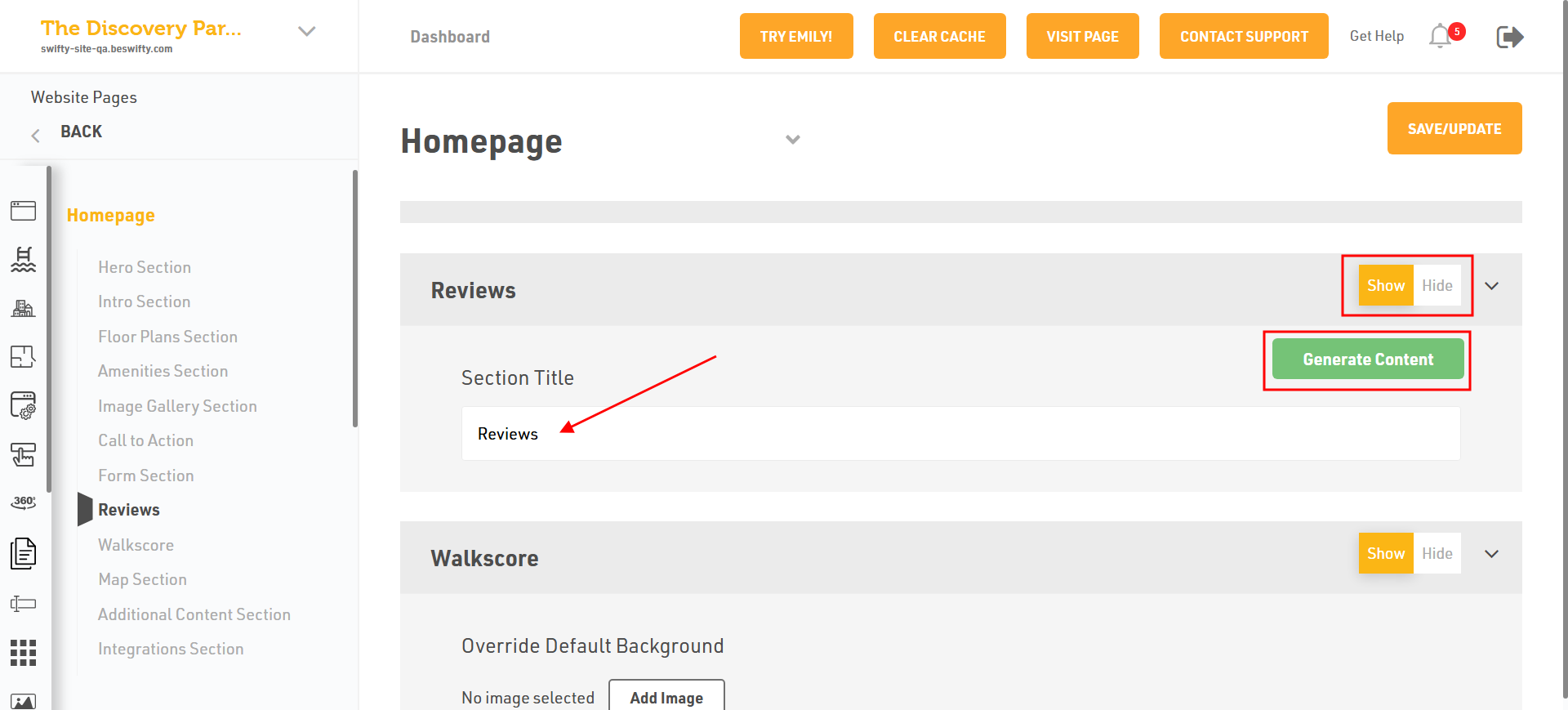 Login to the dashboard of your property website at manage.beswifty.com. Navigate to Website Pages > Homepage Then in the left sidebar click on Walkscore section. You can Show an Hide walkscrore in home page. Walkscore is measures on the scale walking ...