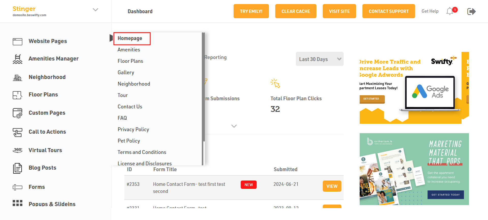 - Login to the dashboard of your property website at manage.beswifty.com.