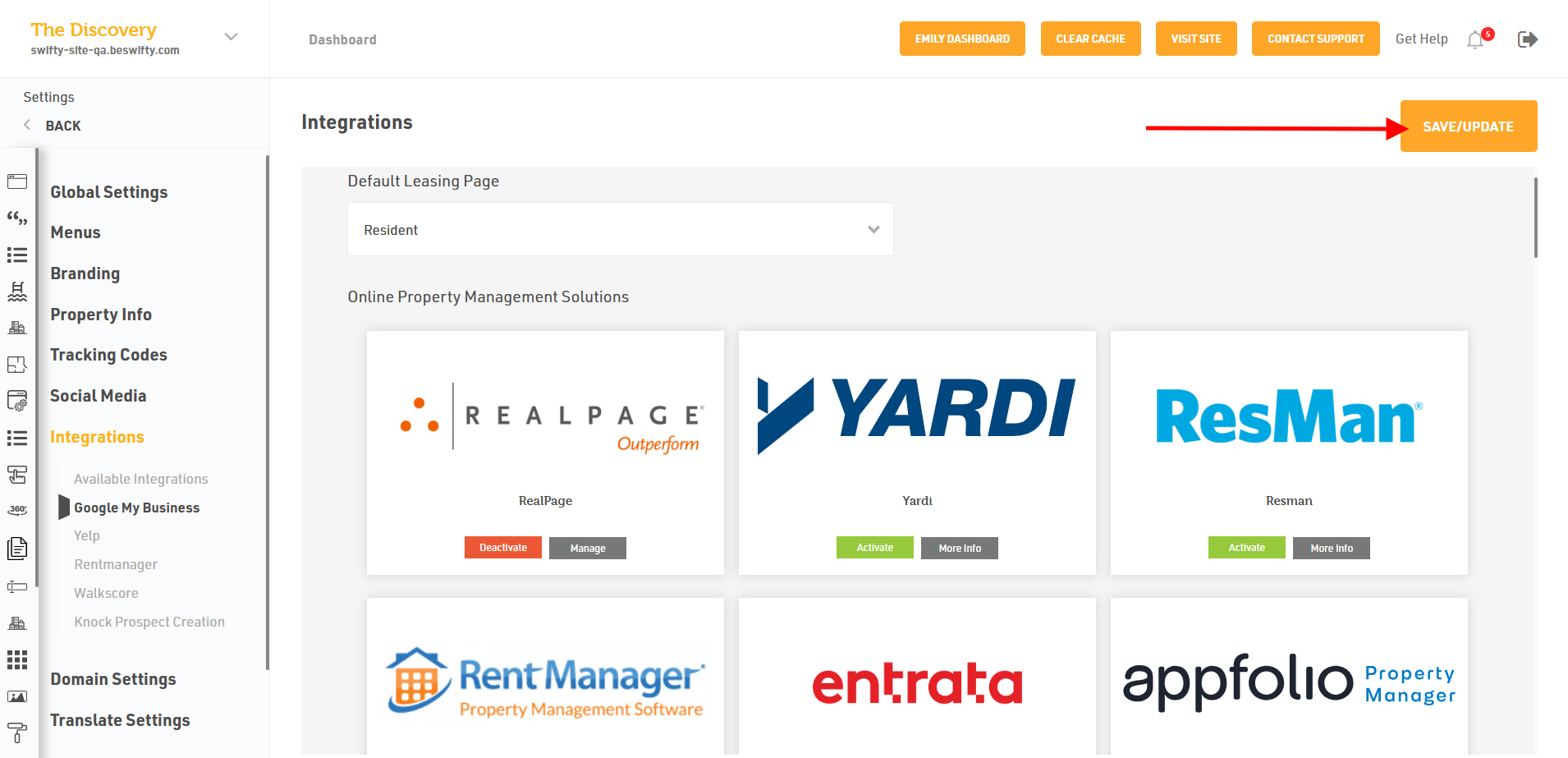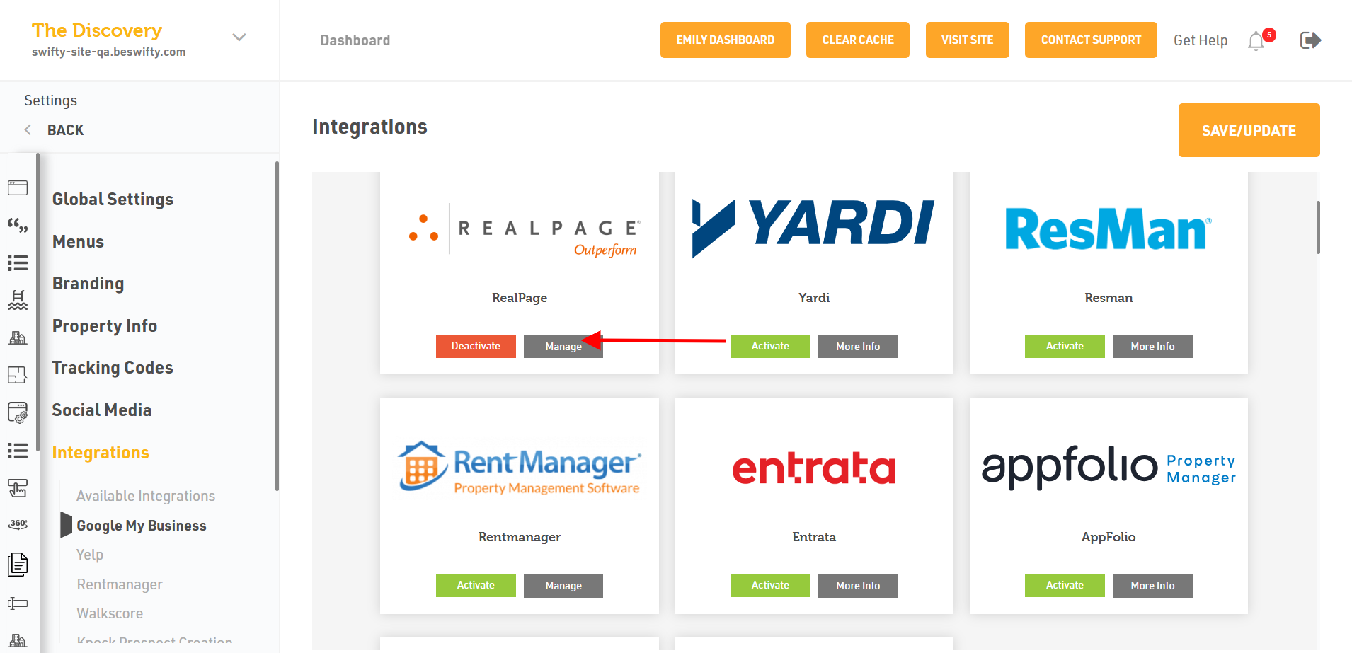 - In Online Property Management Solutions > Activate RealPage and click on the Manage tab.