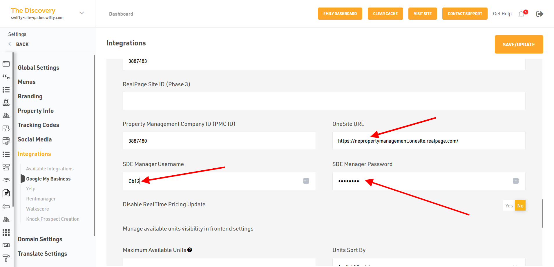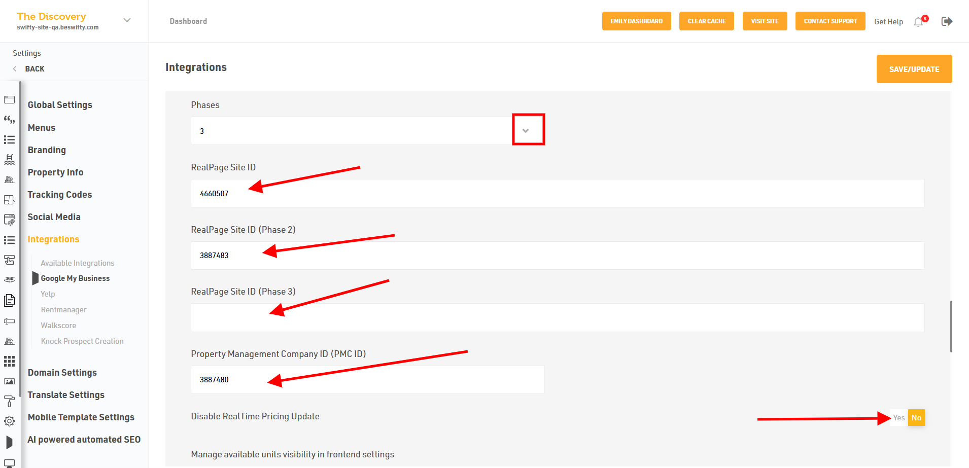 - Later, after all this, fill in the RealPage Site ID (Phases 1, 2 , 3) and Property Management Company ID, and select if you want to disable RealTime Pricing Update.