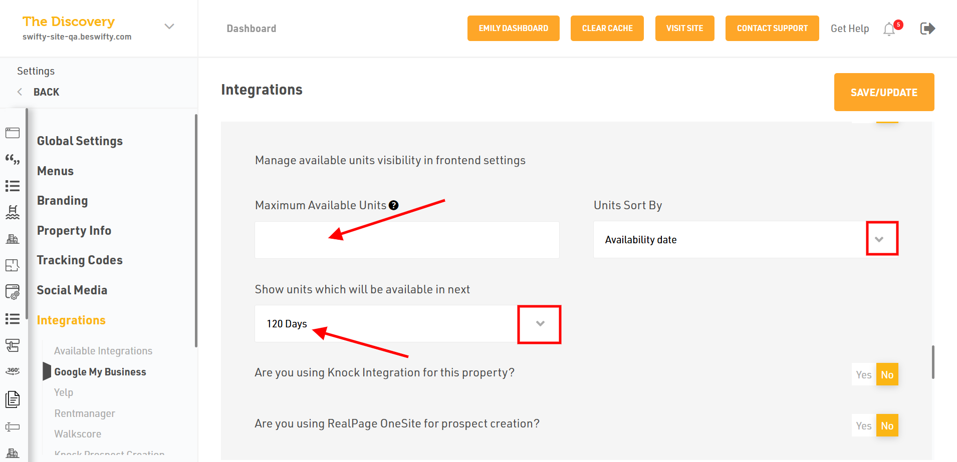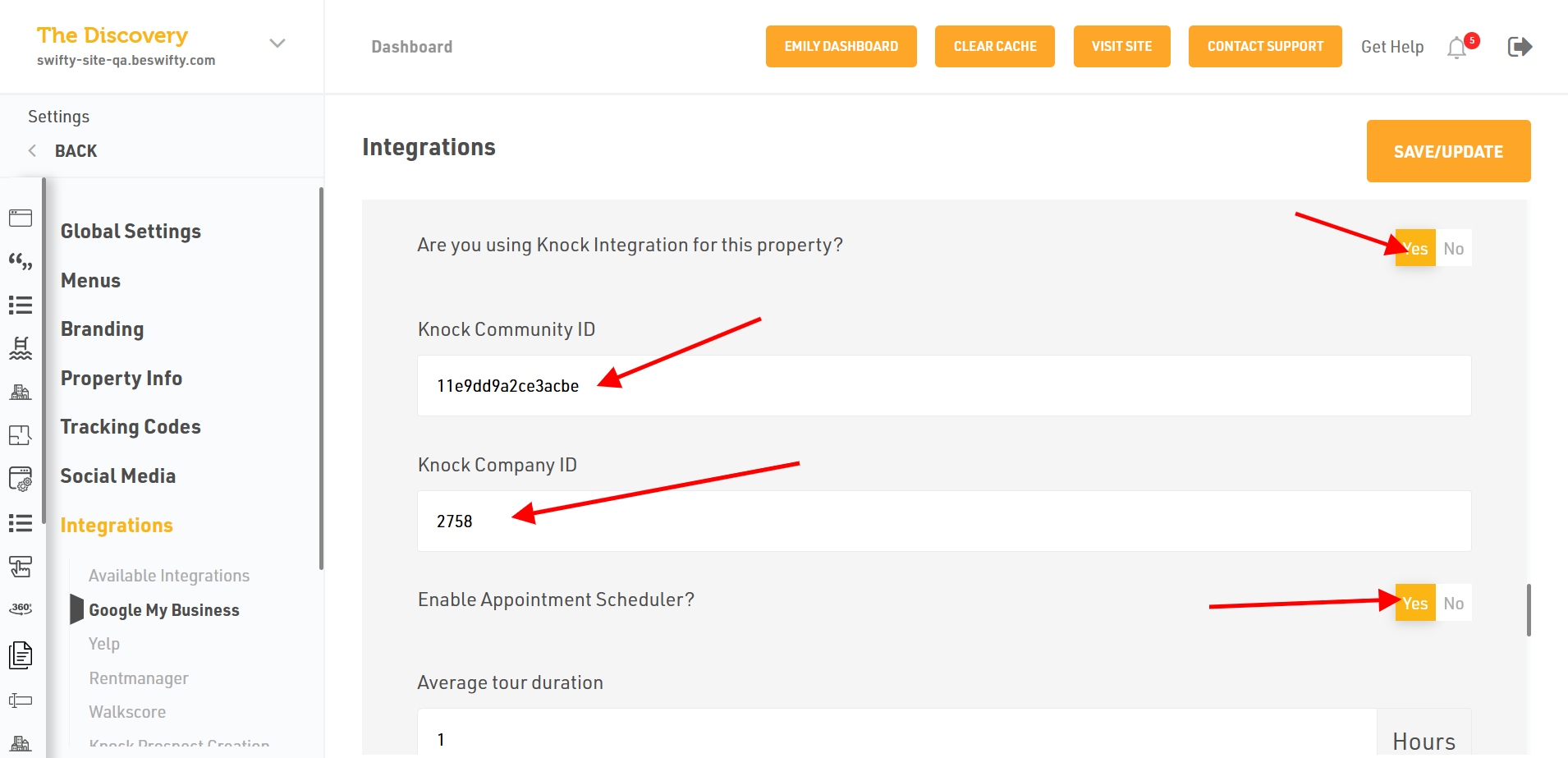 - Later select Yes or No if you want to use Knock Integration for this property. If you select Yes in this step, fill in the Knock Community ID and Knock Company ID. Also select if you want to enable the appointment scheduler or not