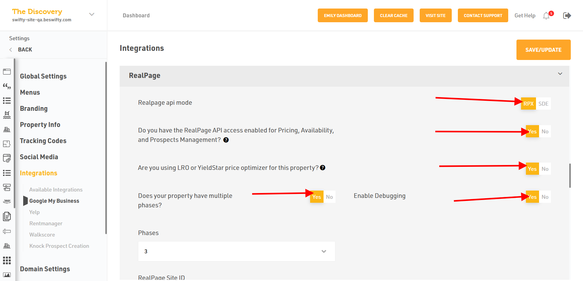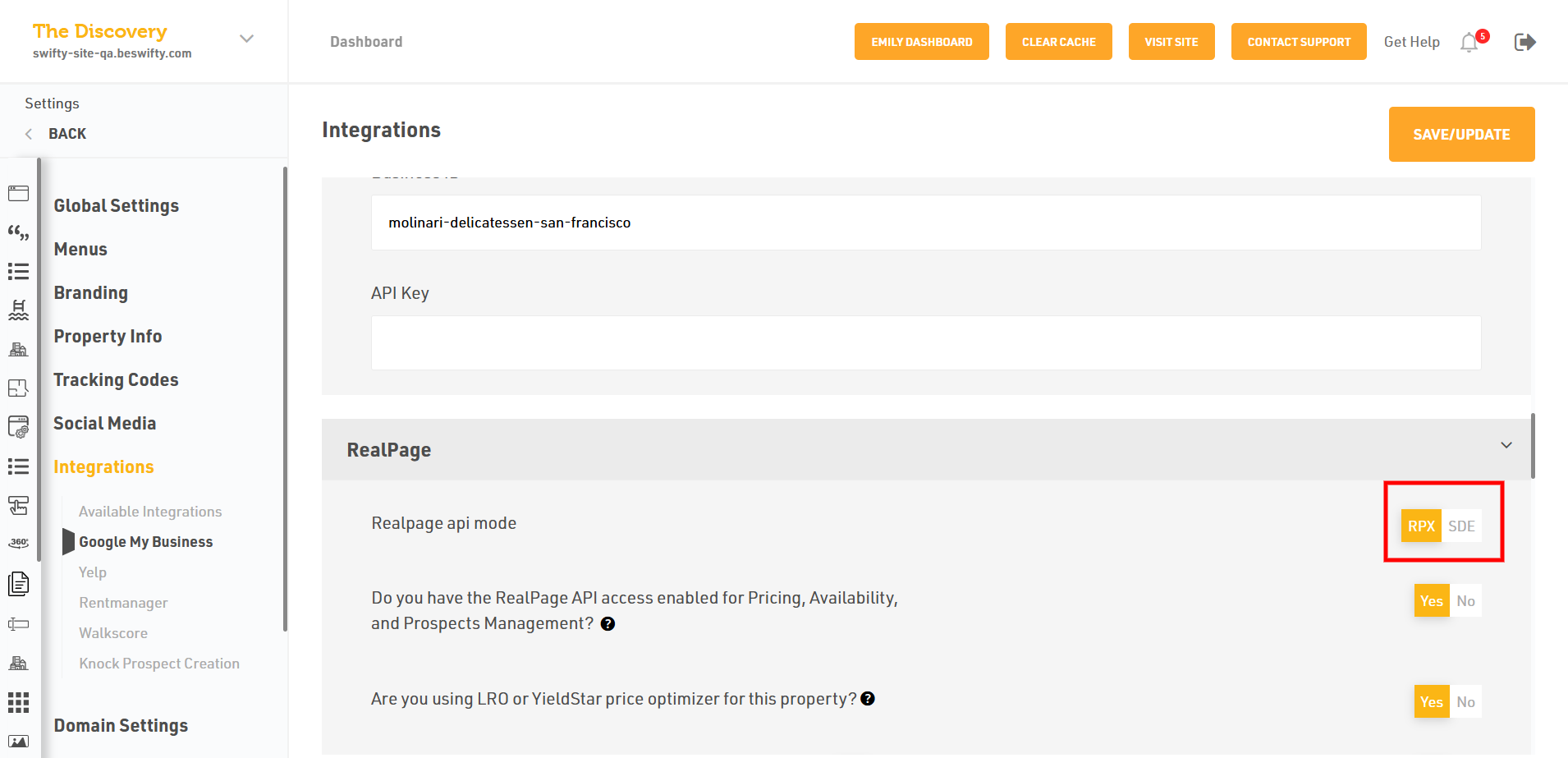 - If you select RPX mode, first select Yes or No if you want to have the RealPage API access enabled for Pricing, Availability, and Prospects Management.